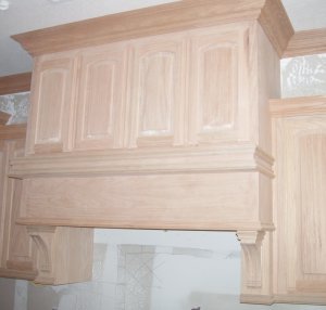 2734 Custom cooktop surround / mantel with corbels / spice rack pull outs in each leg down to countertop |